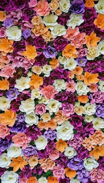 Потрясающее расположение цветов в оттенках розового, оранжевого, фиолетового и белого формирует яркую стену, идеальную для улучшения атмосферы оживленного встречи на свежем воздухе весной