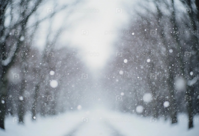 Снег медленно падает на широкую тропу, окруженную деревьями. Земля и ветви покрыты белым цветом