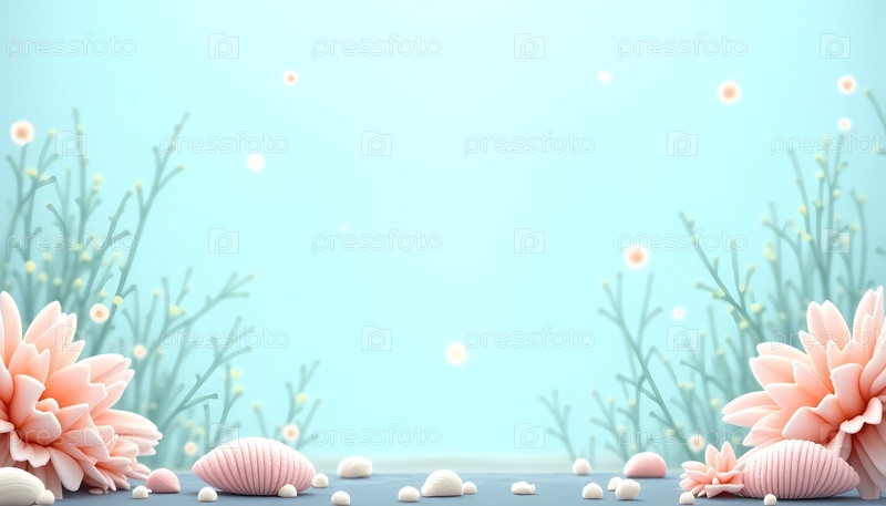 Спокойная подводная сцена с мягкими розовыми цветами и различными раковинами, разбросанными по гладкой поверхности, в окружении нежных зеленых растений на успокаивающем синем фоне