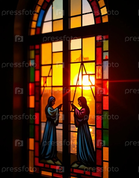 Потрясающее витражное окно отображает две фигуры в богатых цветах, красиво освещенные светящимся закатом солнца, создавая момент спокойного покоя и почтения