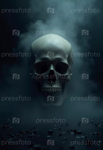 Череп парит в темном, туманном пространстве над глянцевым черным полом.Вокруг вращается таинственный туман, создающий тревожное и атмосферное ощущение