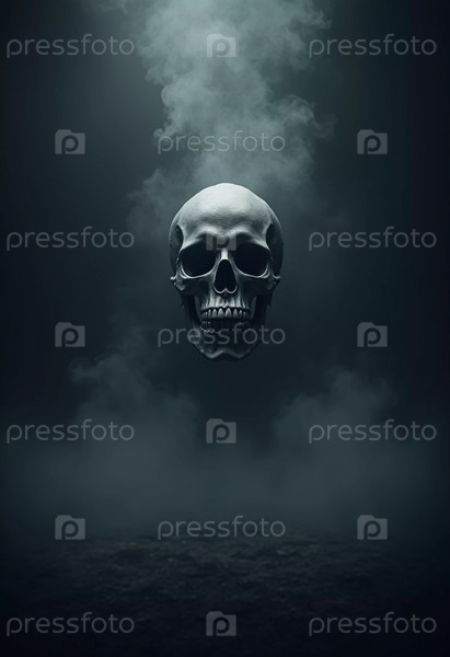 Череп парит в темном, туманном пространстве над глянцевым черным полом.Вокруг вращается таинственный туман, создающий тревожное и атмосферное ощущение