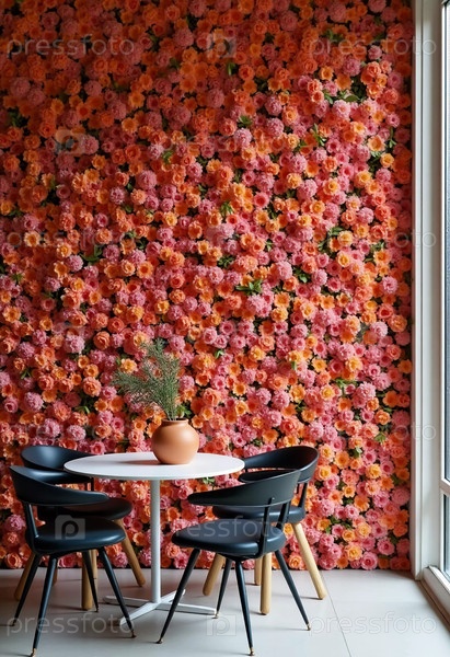 Потрясающая цветовая стена, украшенная яркими цветами, создает веселый фон в уютном кафе, идеально подходит для случайных встреч или спокойного отдыха