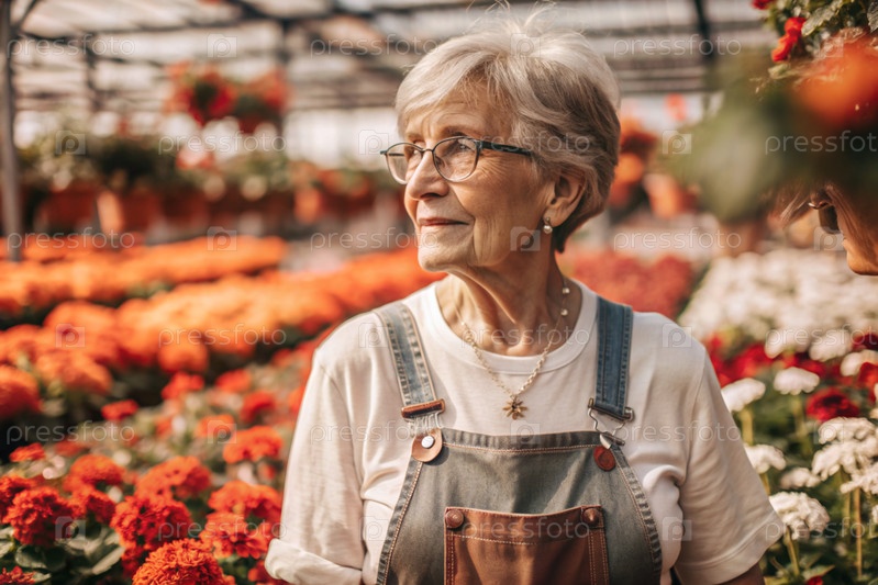 Пожилой садовник с седыми волосами в комбинезоне в уютной цветочной теплице