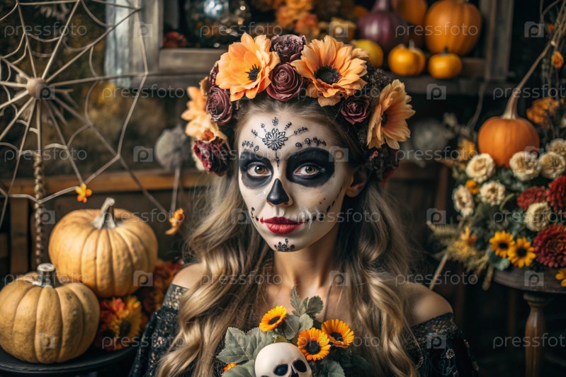 Концепция Хэллоуина. Ужасно. Костюмированная вечеринка. Красивая женщина с покрашенным черепом на лице и цветами на голове. Баннер, открытка