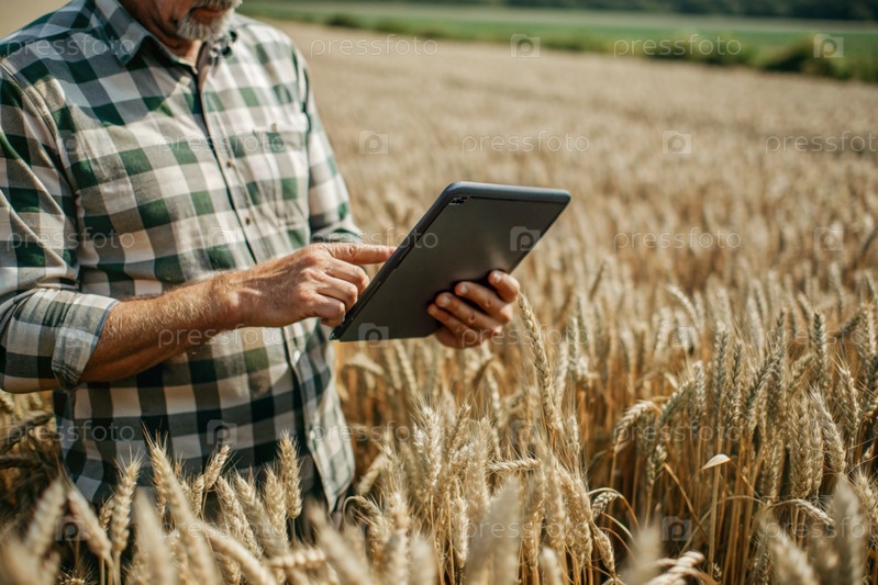 Agronom использует программное обеспечение для обработки онлайн-данных для цифрового сельского хозяйства.Фермер с планшетом в руках стоит на пшеничном поле