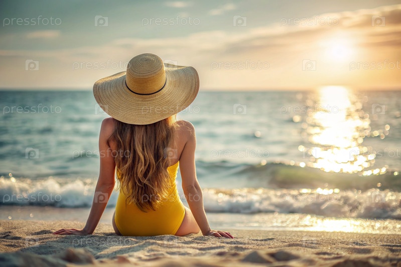 Женщина на отдыхе, сидящая в купальнике и соломенной шляпе с широкими краями на пляже в солнечный день и смотрящая на море
