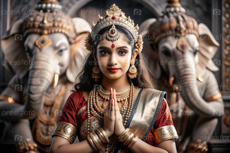 Красивая индийская девушка в традиционном национальном костюме, сари. со слонами. портрет символизирует традиции, культуру и красоту народа Индии
