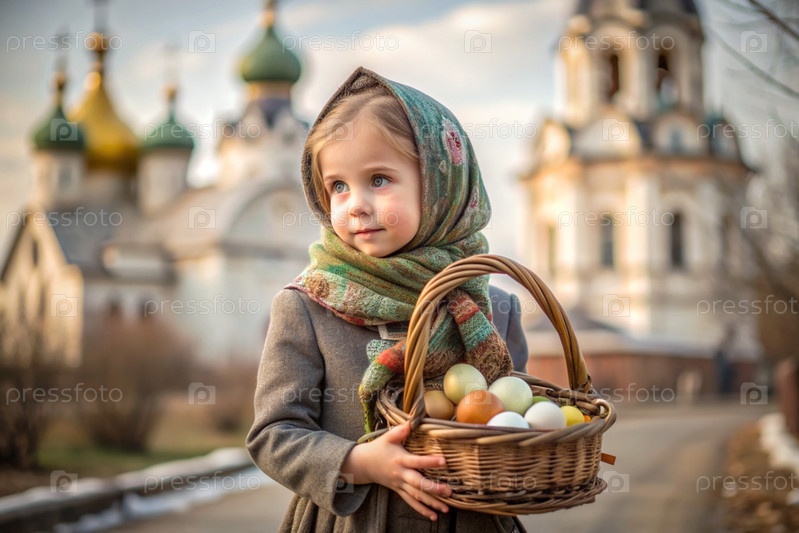 Счастливая Пасха. Христианство. Портрет трехлетней девочки в русском народном платье и шалах с корзиной из плети с пасхальными яйцами в руках на фоне православной церкви