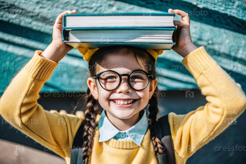 Красивая девочка с очками и книгами на голове.Ребенок впервые ходит в школу.Дети на свежем воздухе.Возвращение к школе