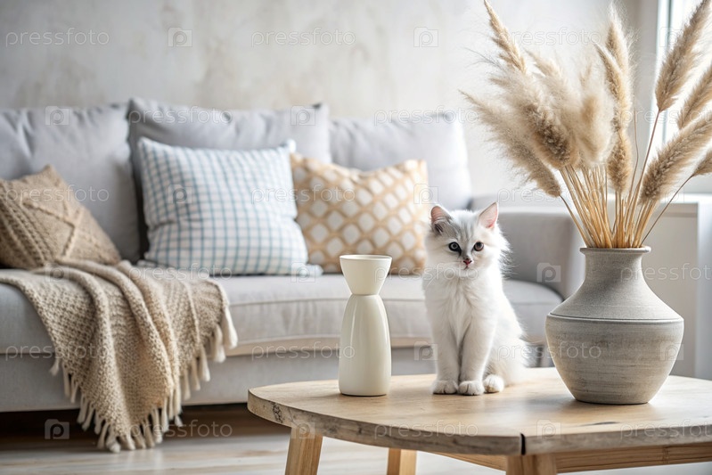 Белый пушистый котенок в современном скандинавском стиле интерьера