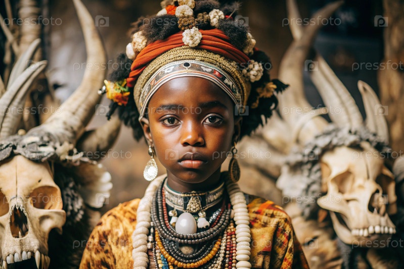 Красивая африканская девушка в традиционном национальном костюме. с костями. портрет символизирует традиции, культуру и красоту африканского народа