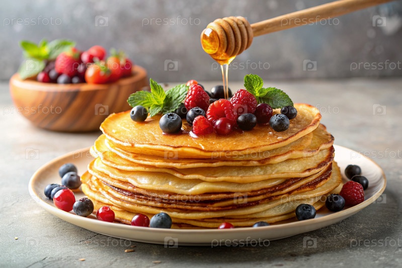 Вкусные блины с медом, ягодами, чернилами, клюквами и малиной.Концепция российского праздника Масленица