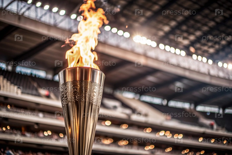 Пламя олимпийского факела горит на фоне спортивного стадиона, арены и красивой размытой стороны