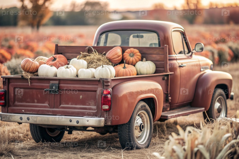 Осень, осенний дизайн.Большой урожай тыквы на заднем сиденье ретро-пикапа, крупный план