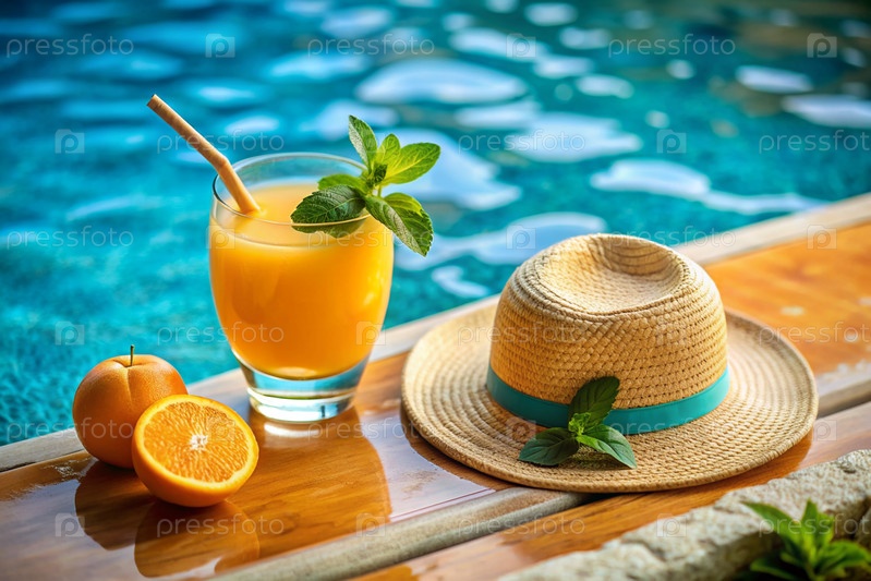 Стакан вкусного свежевыжатого апельсинового сока на фоне бассейна.Свежий апельсиновый сок с апельсином, кубиками льда и мятой
