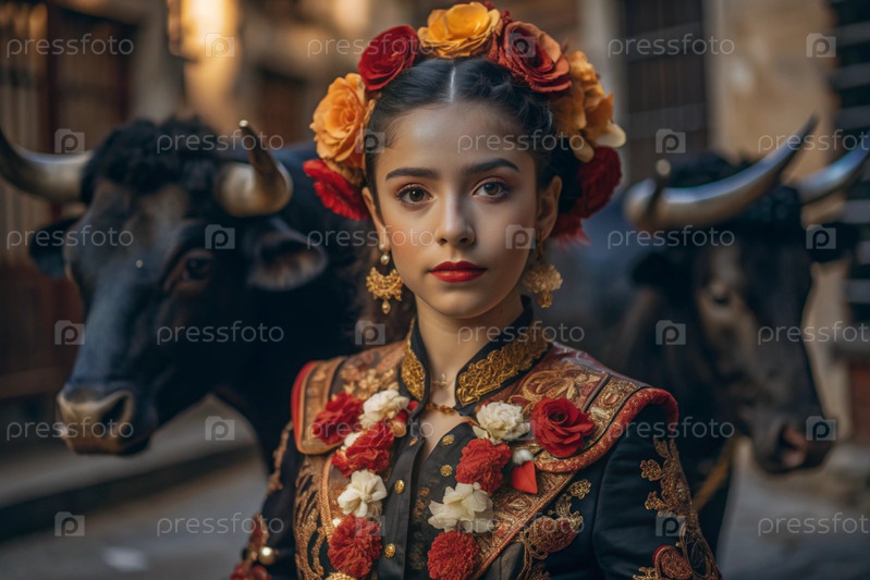 Испанская девушка в традиционном испанском национальном костюме. Перед быком. Бикоборство. Портрет символизирует традиции и культуру народа Испании