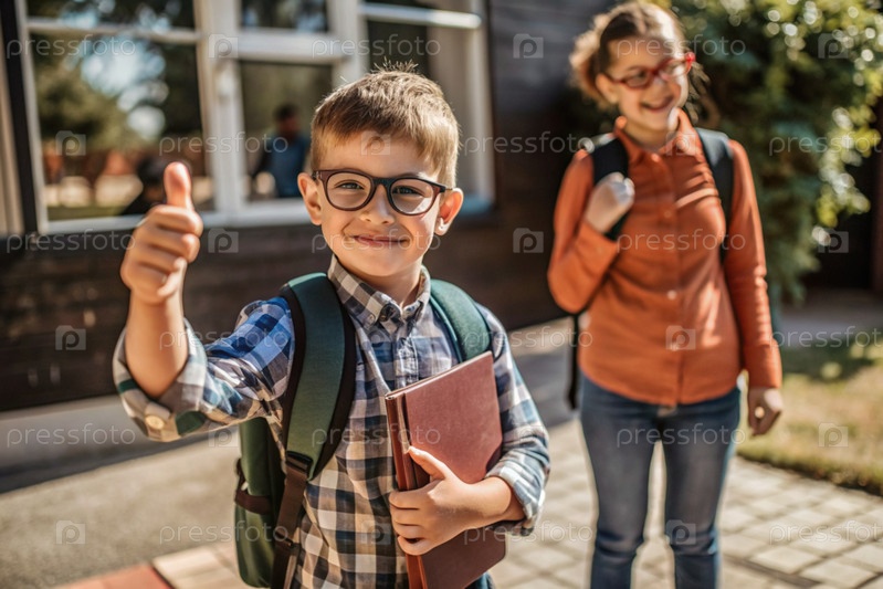 Мальчик с очками показывает класс своей рукой. Ребенок впервые идет в школу. Ребёнок со школьной сумкой и книгой. Ребёнок в классе с доской на заднем плане. Возвращение к школе