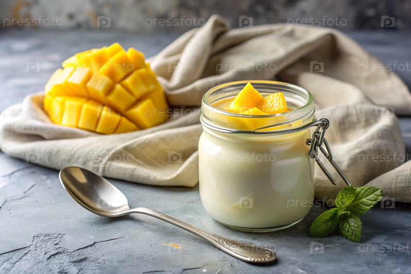 Домашний персиковый йогурт со свежими персиками, винтажной ложкой и полотенцем на стильном сером фоне