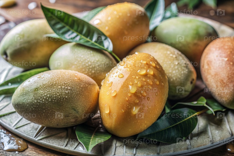 Свежие манго. Вкусные ягоды и фрукты ярко-желтого цвета с капельками воды. Вегетарианство. Здоровое питание. Свежий плод на столе
