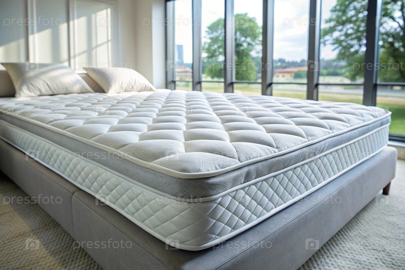 Новый белый роскошный комфортабельный ортопедический матрас на кровати в светлой спальне