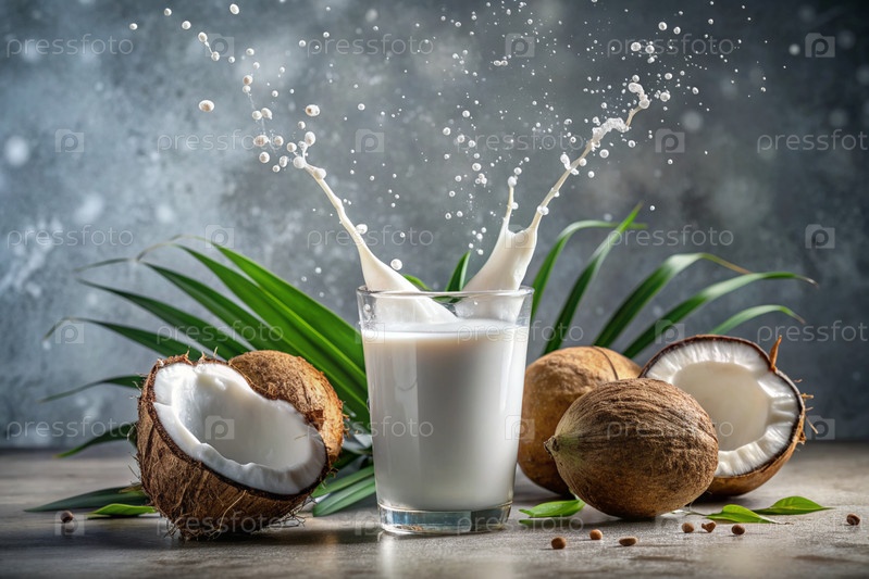 стакан кокосового молока и кокосов с щелчками молока на сером фоне. веганское кокосовое молоко - это немолочное или безмолочное молоко. здоровая веганская еда