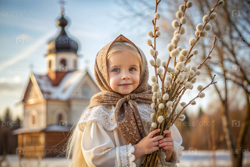 Пальмовое воскресенье. христианство. портрет трехлетней девочки в русском народном шале с ветвями ивы в руках на фоне православной церкви