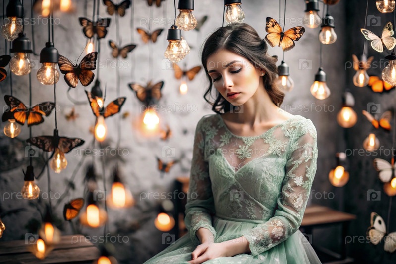 Портрет красивой девушки в зеленом платье среди многих подвешенных лампочек и бабочек, размахивающих вокруг нее