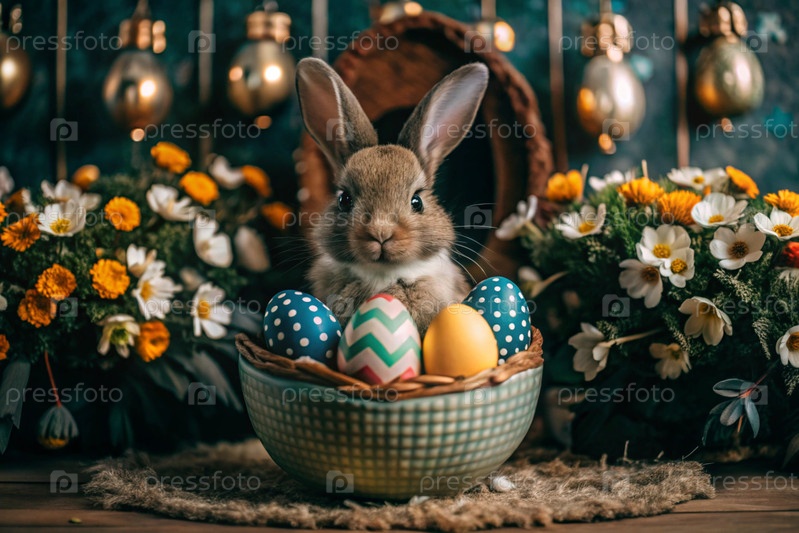 Известный праздник. милый пасхальный кролик заглядывает из пасхального яйца и разноцветные яйца разбросаны вокруг. концепция счастливой Пасхи