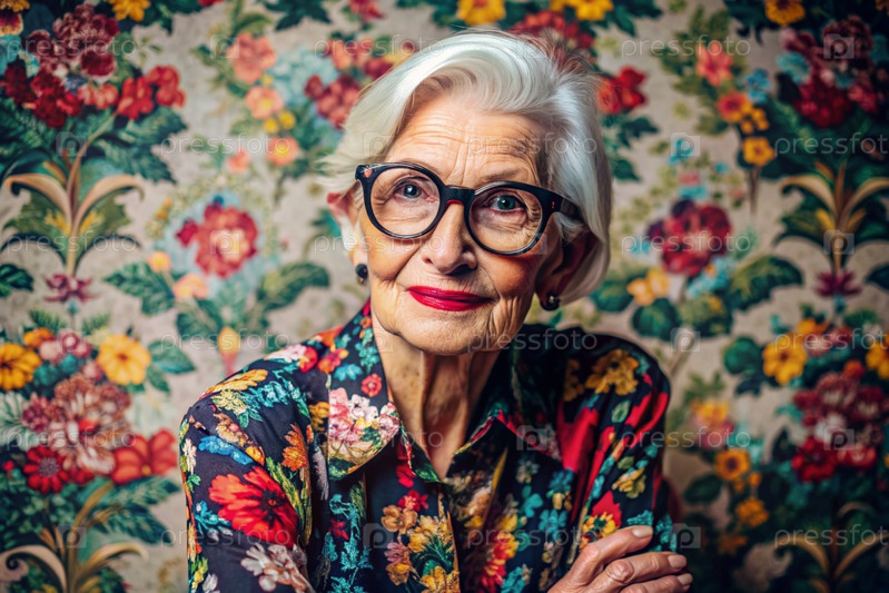 Портрет стильной, модной пожилой женщины, пенсионерки 70 лет, которая носит очки и одежду с цветочными оттисками