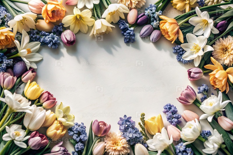 Красивый цветочный фон. Рама весенних цветков с тюльпанами, нарциссами, крокусами, гиацинтами. Вид сверху. Пространство для текста