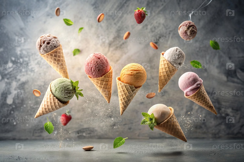 сладкий десерт. морозильные шишки с различными вкусами на бетонном сером фоне. Всемирный день мороженого