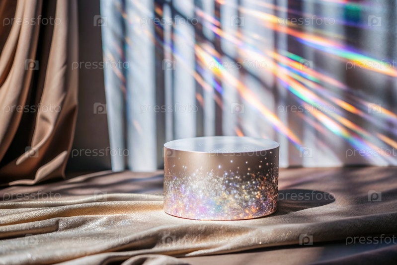 Пустой цилиндрический подиум со сверкающими кристаллами при преломлении света на минималистическом фоне, стенд для демонстрации моделей косметики и товаров