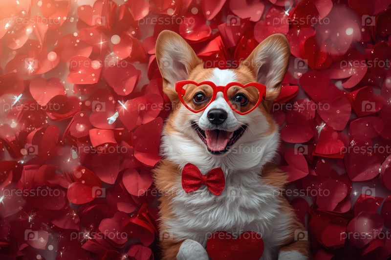 Красивый баннер на День святого Валентина с влюблёнными собаками и красным сердцем. Вид сверху. Романтическая и любящая атмосфера