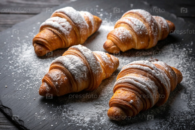 Вкусные свежевыпеченные кроассанты на тёмном фоне сланца. французский завтрак. хорошие ближневые выпечки. пекарня со вкусным хлебом. кондитерские изделия