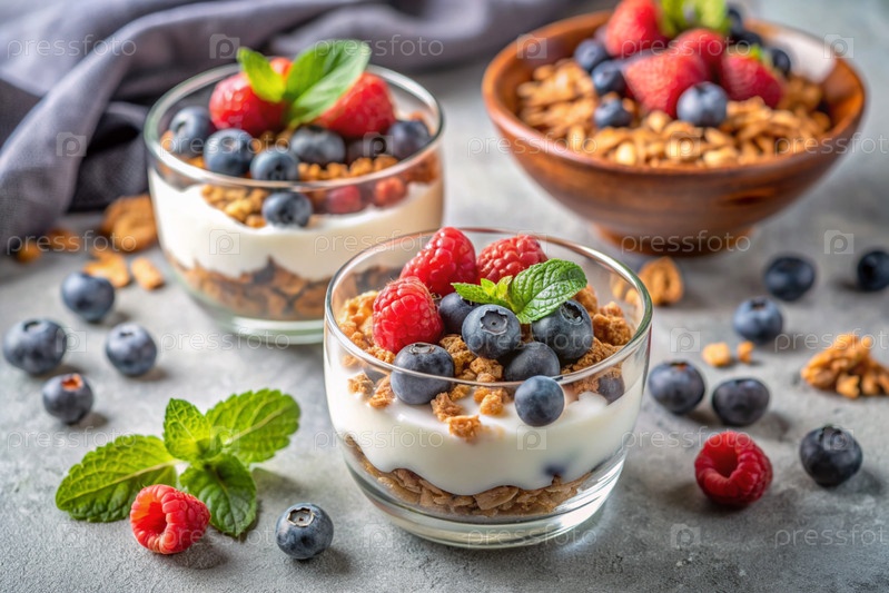 миска домашнего йогурта, мусли, ягод и орехов. здоровый и вкусный завтрак. доброе утро