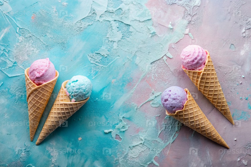 сладкий десерт. морозильные шишки разных вкусов. синий, розовый и фиолетовый мороженое на фоне трех пастельных цветов: синего, розового и фиолетового