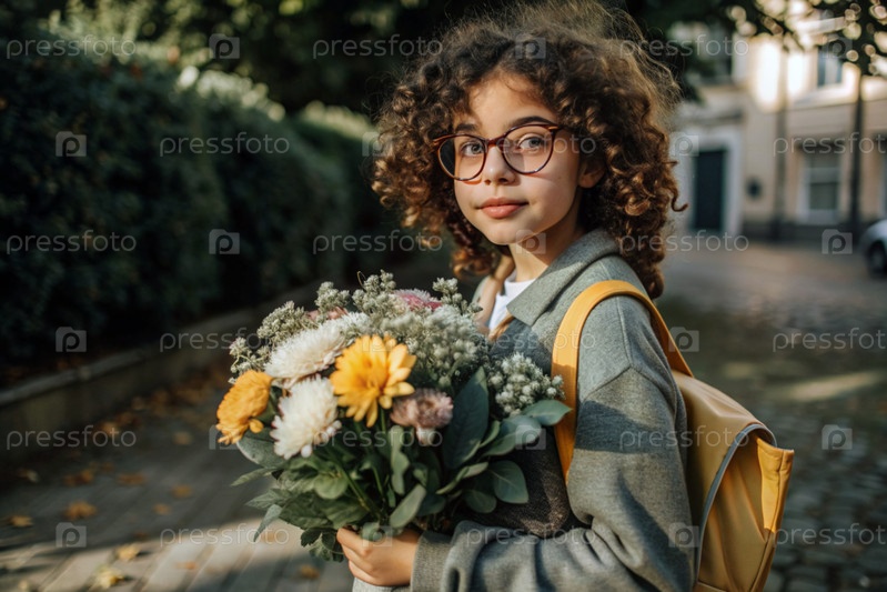 Красивая маленькая кудрявая девочка в очках и букете осенних цветов ходит в школу впервые. Ребенок со школьной сумкой, книгой и цветами. Малыш на городской улице. Возвращение к школе
