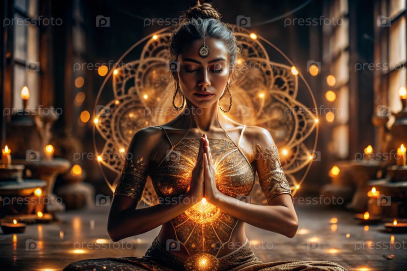 Концепция эзотерической духовной медитации, женщина в позе лотоса.Человеческая медитация, духовность и активация чакр, мистический дух