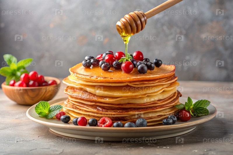 Вкусные блины с медом, ягодами, чернилами, клюквами и малиной.Концепция российского праздника Масленица