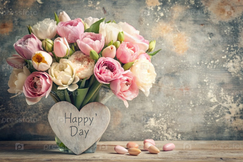 Открытка, баннер Дня матери с розовыми цветами, сердца на винтажном сером деревянном фоне