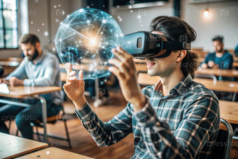 Мальчик с очками виртуальной реальности. Ребенок находится в классе, а другие ученики на заднем плане. Цифровой интерфейс отображается в наушниках