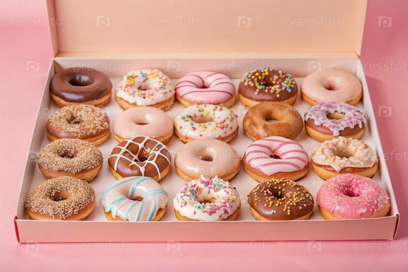 Вкусный десерт. больная коробка различных пончиков с красочными посыпаниями на столе. кондитерские изделия