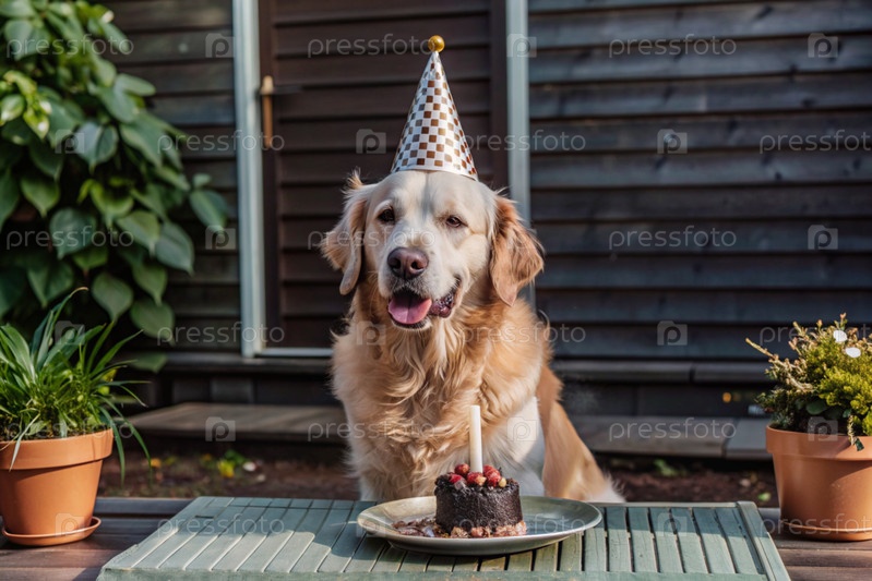 Собака сидит с тортом, воздушными шарами и флагами на вечеринке по случаю дня рождения