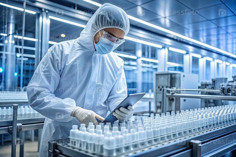 Производство лекарств: фармацевт тестирует медицинские флаконы на автоматическом трубопроводе фармацевтической производственной линии с использованием искусственного интеллекта
