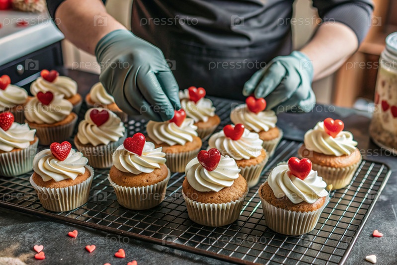 Профессиональный кондитер в перчатках украшает кексы сливочными и красными сердцами