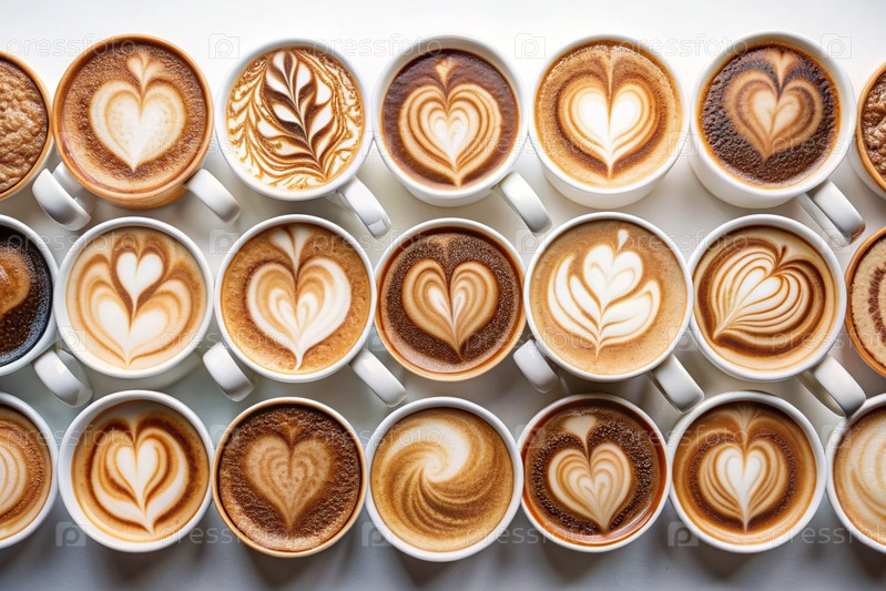 Много различных кофейных напитков на белом столе
