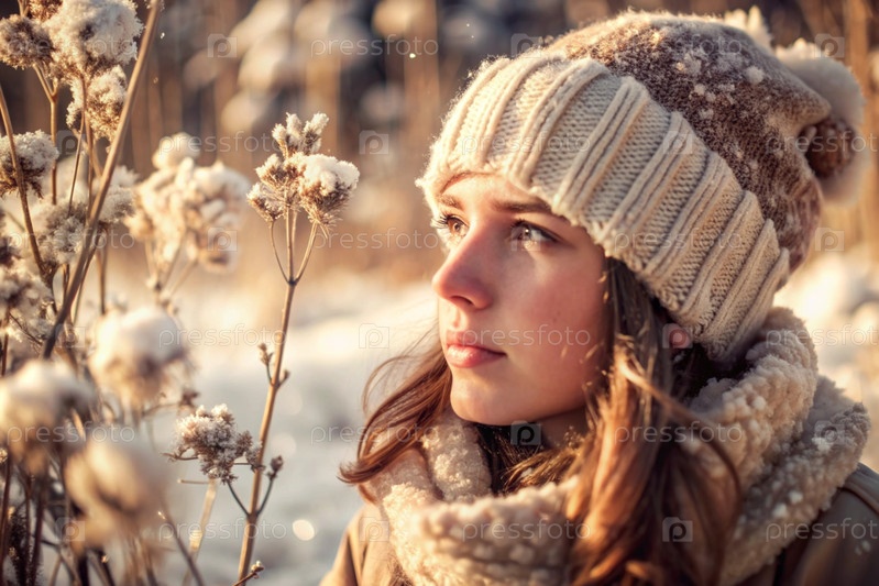 Зимний портрет. Близкий план молодой девушки в вязанной шляпе, шарфе и наружной куртке