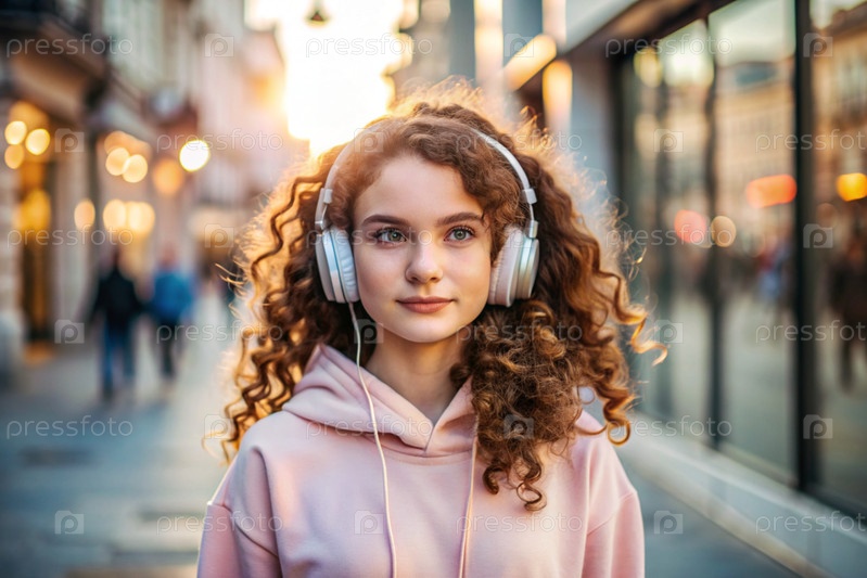 Молодая красивая кудрявая женщина слушает музыку с наушниками на вечерней улице города при закате солнца.Мир, гармония, отдых и расслабление