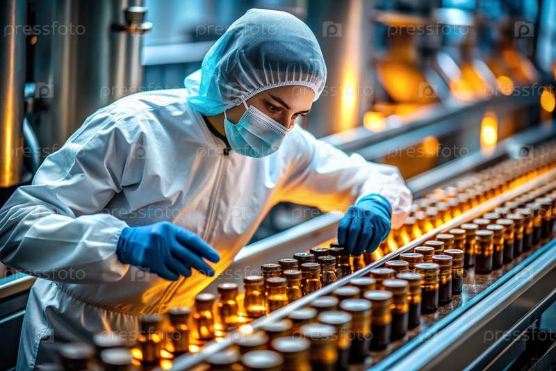Производство лекарств: фармацевт тестирует медицинские флаконы на автоматическом трубопроводе фармацевтической производственной линии с использованием искусственного интеллекта
